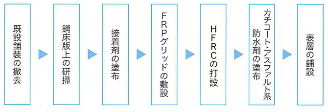 鋼床版上の従来の基層であるグースアスファルトの代わりに、エポキシ系接着剤で鋼床版とハイブリッド有機繊維補強コンクリート(HFRC)を合成し、既設鋼床版の疲労耐久性を向上させることを目的として実施しているのがHFRC舗装です。