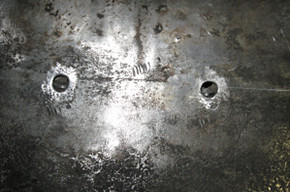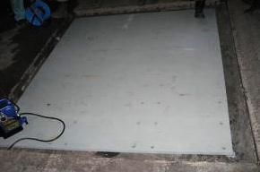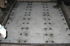 鋼床版は、車両の繰り返し荷重により疲労き裂が発生することがあります。デッキプレートにまでき裂が進行している場合は、舗装を剥ぎ取った後、デッキプレート表面を研掃してき裂の進行状態を確認後、き裂先端にストップホールを打ちます。更に、デッキプレートの上面に厚さ12mmの鋼板を高力ボルトで結合し、耐力を向上させます。